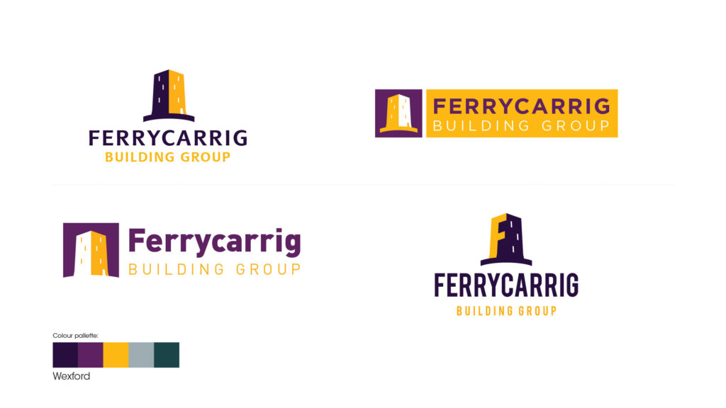 These logos are based on the Ferrycarrig castle, with colours linked to Wexford. This helps give the company an established feeling. Purple is a colour not associated to any big construction brands, so it helps differentiate Ferrycarrig from competitors.