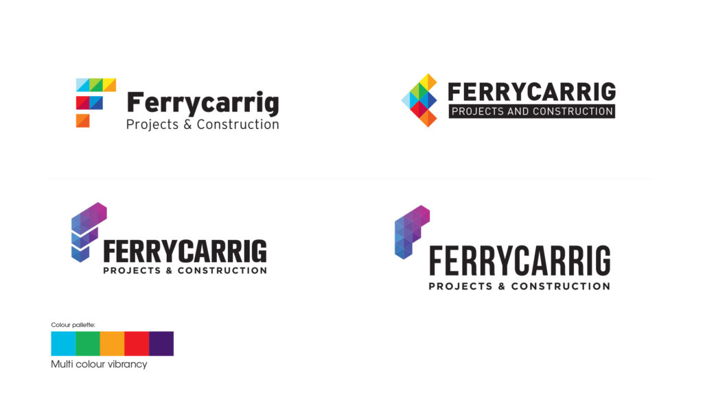 These logos are based on blocks and elements that combine and build the F in Ferrycarrig. This evokes a feeling of construction and building in an abstract, modern way. The simple and minimal marks are created and paired with bold geometric typefaces, as well as a bright colour palette to add vibrancy and impact.